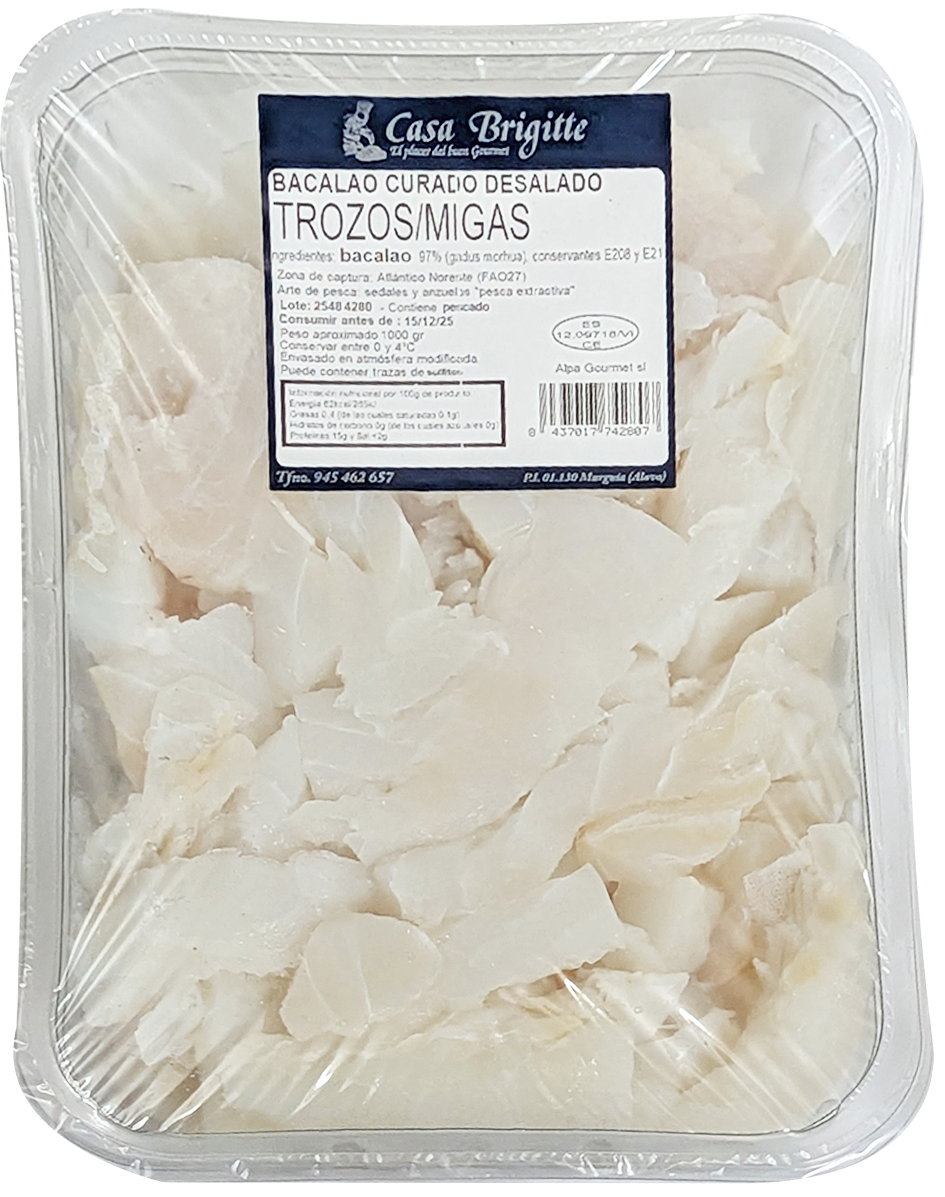 Recortes de nuestro bacalao, sin menospreciar su calidad, ya que proviene del mismo filete que los demás bacalaos. Ideal para Pinchos , ensaladas, como relleno de croquetas o pimientos, rebozados,…
