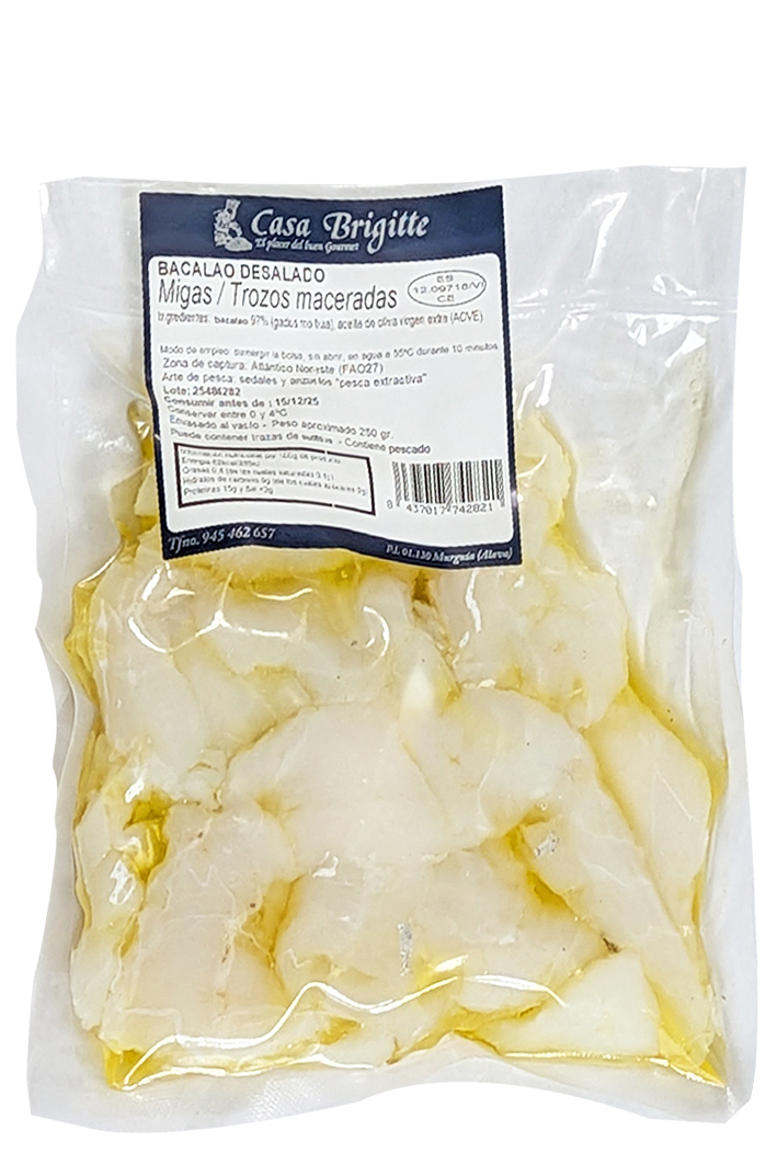 Se trata de un producto pesquero transformado procedente de bacalao (Gadus Morhua), cortado y clasificado y que ha sufrido un proceso de desalado hasta conseguir un porcentaje de salinidad inferior al 3%, envasado en atmósfera modificada o al vacío con aceite y conservado en refrigeración.